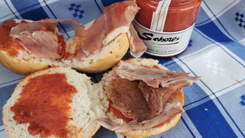 Panes de La Faustina, Jamón crudo y Chivito de Lo de Elio y Familia, Pasta de tomate al Malbec de Sabores Delicatessen
